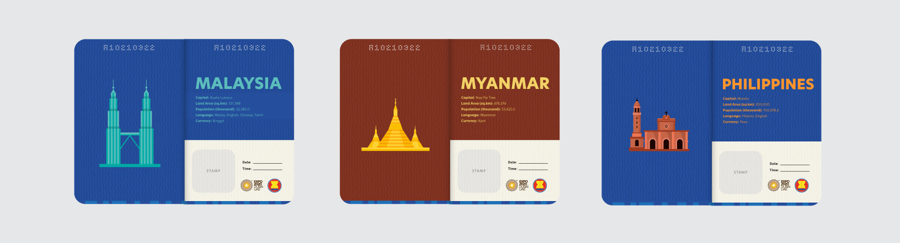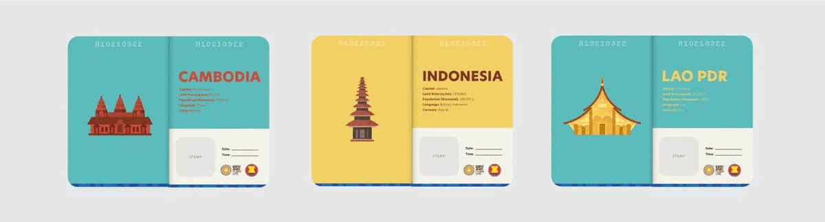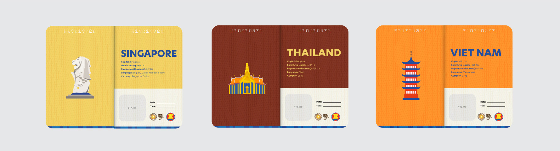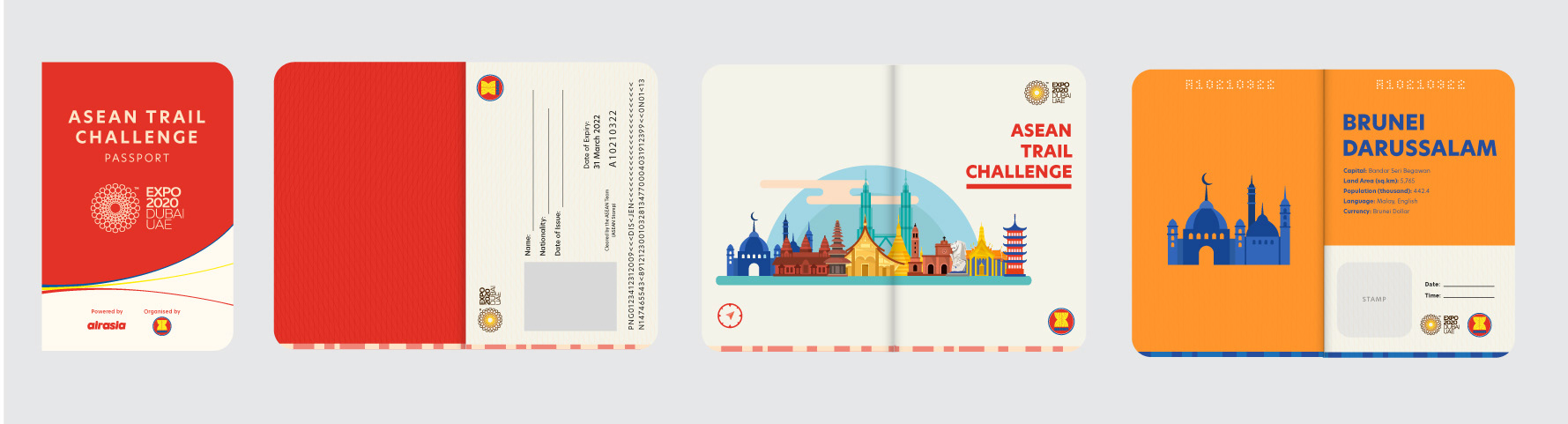 I was asked to create a 'passport' for the ASEAN Trail Challenge – an event organised by Expo 2020 Dubai. The idea was to provide attendees with a booklet featuring ASEAN countries, so stamps can be collected on every stop during the 6.5km walk challenge.